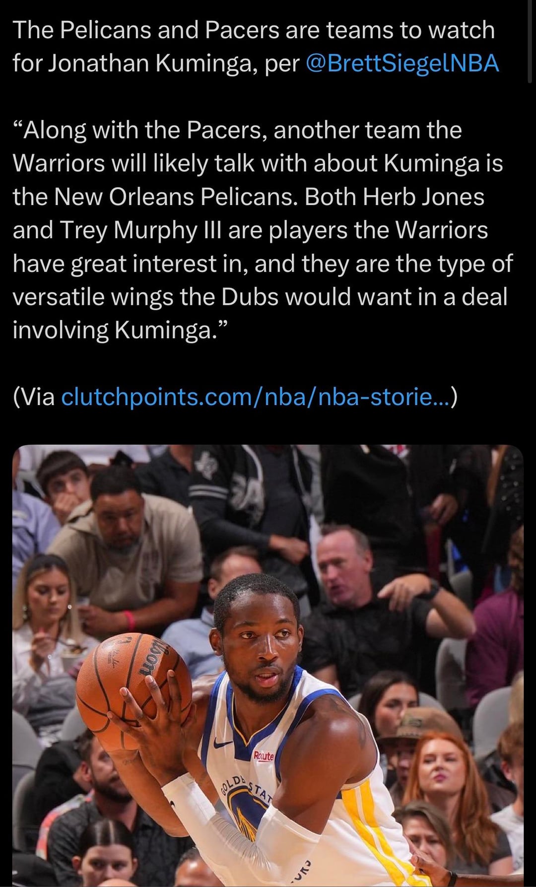 Apparently the Pels have interest in Kuminga. Warriors want Trey and/or Herb