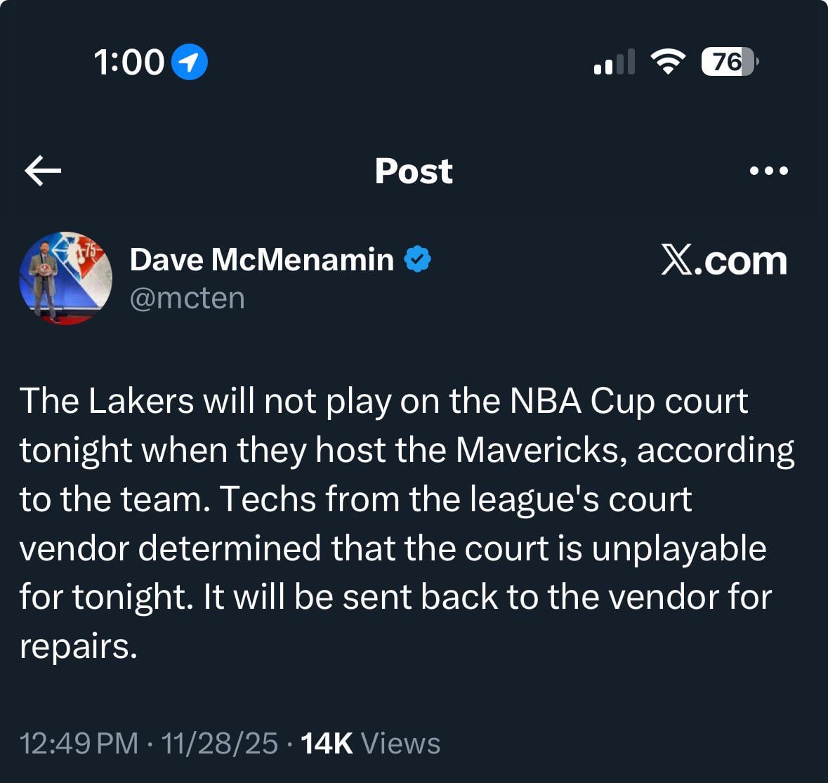 The Lakers will not play on the NBA Cup court tonight when they host the Mavericks, according to the team. Techs from the league’s court vendor determined that the court is unplayable for tonight. It will be sent back to the vendor for repairs.
