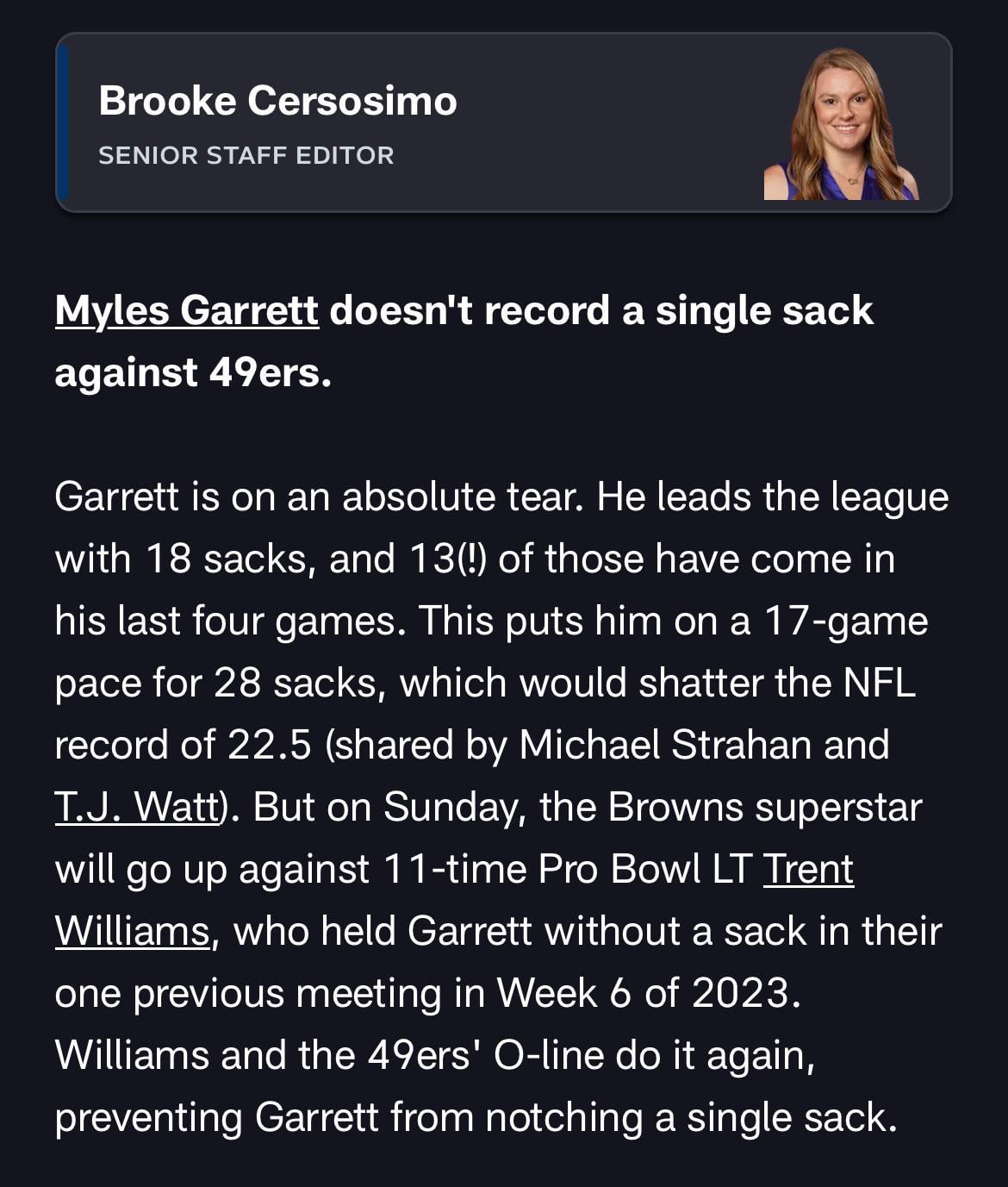 I like the thought. I don’t believe it, but I like it. 15 comments Maybe if we throw less than 10 passes and with the weather forecast that’s possible. Can’t get sacked if you don’t throw it Does she realize Myles can line up on the other side? Trent Williams is an absolute stud OT. But to think he’s going to be able to handle Garrett one on one all game is ludicrous. Last time we played Cleveland he got 1 solo tackle. Only has 3 solo tackles combined. So its possible That was the game we learned Moody was a fraud. press X to doubt  This is why right tackles are equally as important as left tackles. All Myles Garrett has to do is line up on the other side and he has a massive advantage. This is the way. What gambling site is she promoting? No shit, George kittle will be blocking him the whole time! In Trent we trust. If he lines up on McKivit’s side we are screwed. Just give him the sack If she’s right we need to see if she’s made of wood. Leave a ReplyYou must be logged in to post a comment.