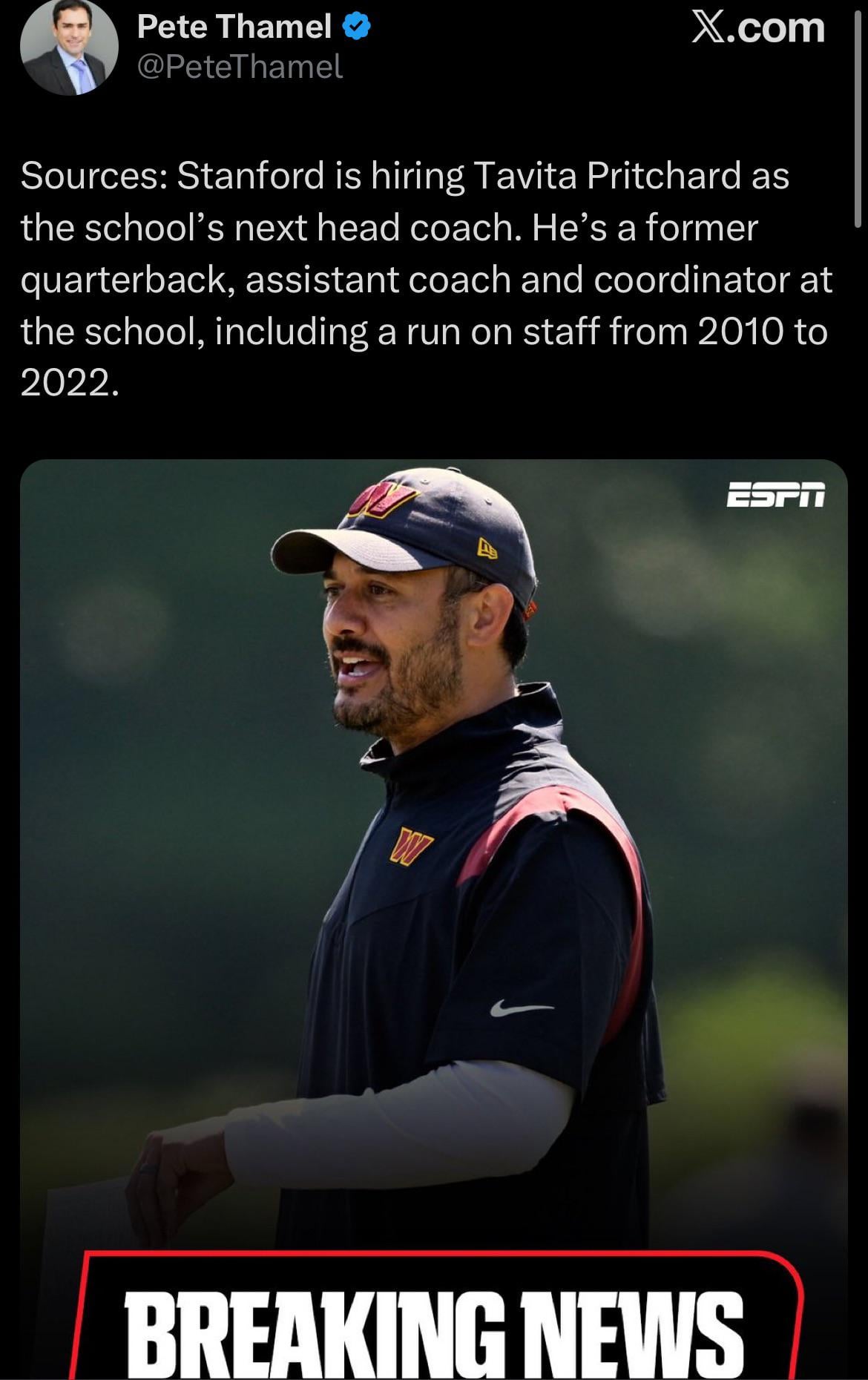 BREAKING: Commanders QB coach Tavita Pritchard is set to become the new Head Coach of Stanford football