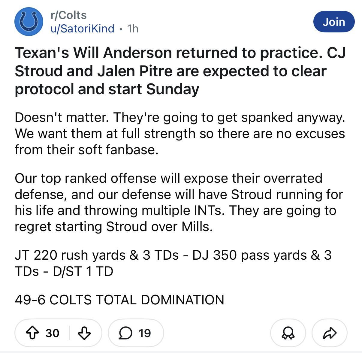 Their top comment is “If you think we are putting up 49 on the Texans D, I’ve got a bridge to sell you.” so even Colts fans recognize this as dumb as fuck lol