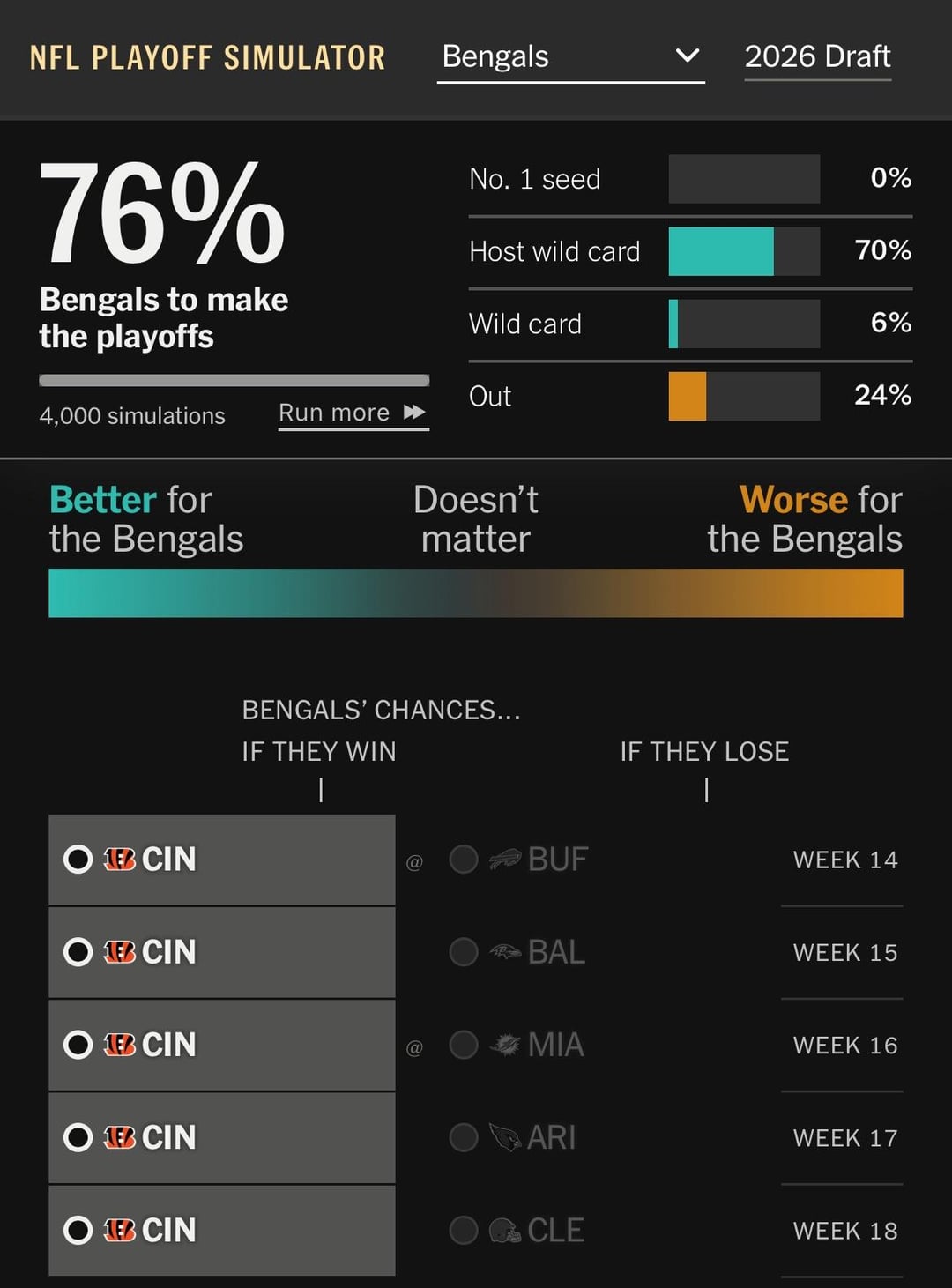 Per the NYT’s playoff simulator, the Bengals have a 76% chance of making the playoffs if we win our remaining 5 games. It’s unlikely we can make it as a wild card, seeing that multiple teams would need to implode weeks 13-18. Therefore, our best bet of making the playoffs is for us to win the AFC North.