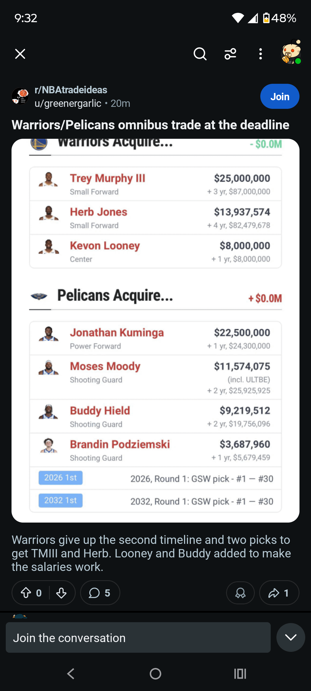 I’m not saying this is a GOOD deal, but I think it’s closer to a deal that might actually get done than people think. After how badly the Queen deal has been panned by media and fans all across the league, I think Joe might be willing to give up quite a bit to get back into the first round of the draft this year. A first and a “promising” “young” player like Kuminga or Podz might very well net a team ONE of Trey or Herb at this point