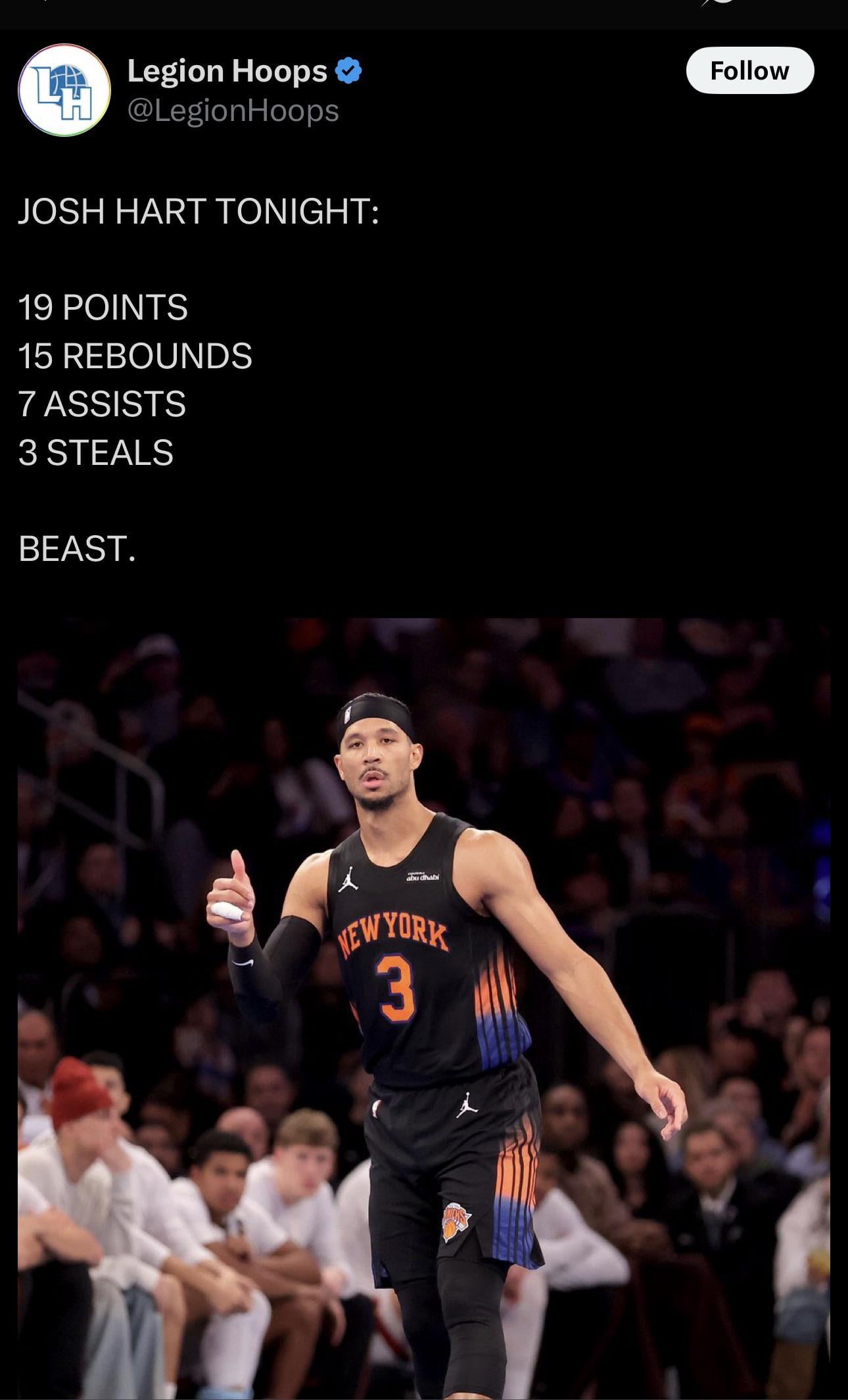 2. LMAO to that moron on this sub that said earlier that the Knicks would consider trading Josh.