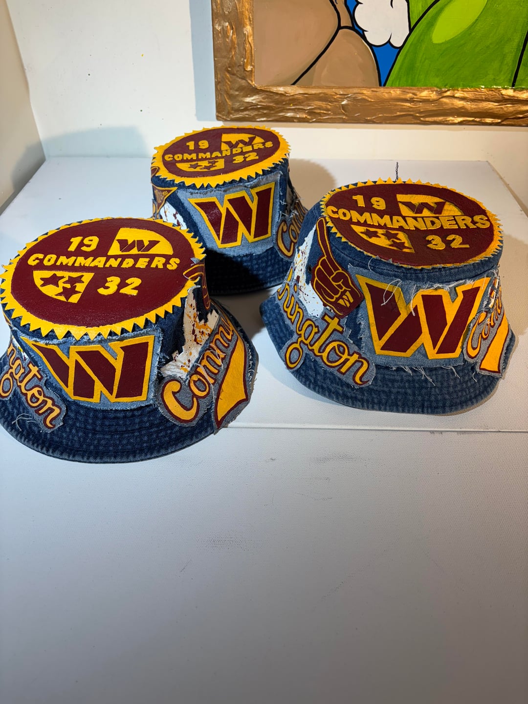 Hand crafted out of hardened denim fabric that’s then cut carved into letters and other figures. Then painted and attached to the body of the hats Leave a ReplyYou must be logged in to post a comment.