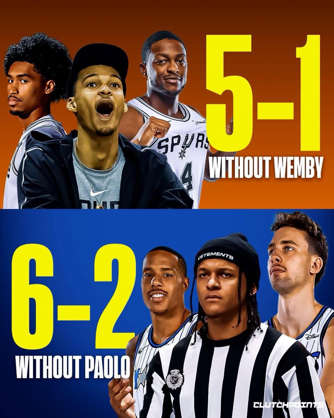 Orlando is 25-18 without Paolo, and 27-31 with him (compared to 18-24 for the Spurs without Wemby and 30-29 with him).