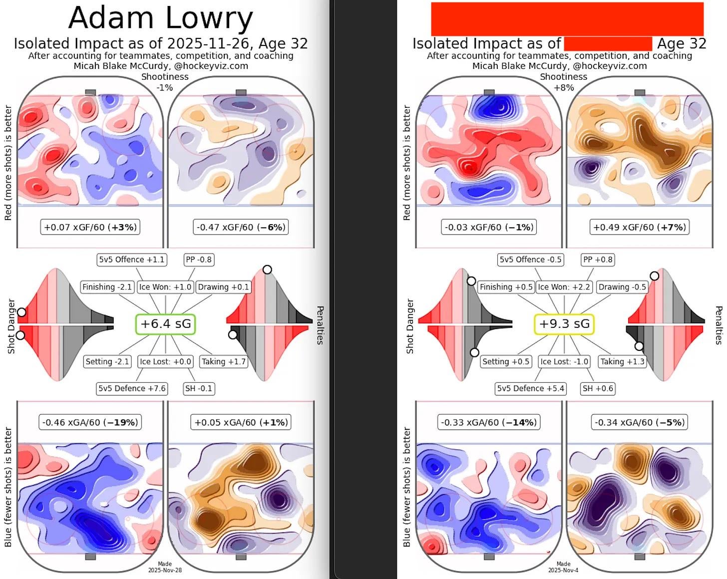 The difference between this other centre at the same age and Lowry is almost exclusively just that Lowry shoots the puck less, and has lower personal/on-ice shooting percentages (whether that's due to talent, luck, linemates, usage, or mix of all of the above, I'll let you decide).