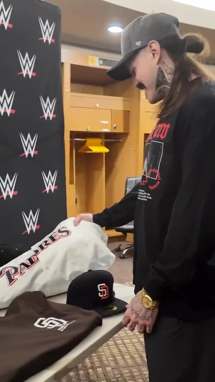 Dominik Mysterio is welcomed home with some gear from Padres! ⚾️ Survivor Series