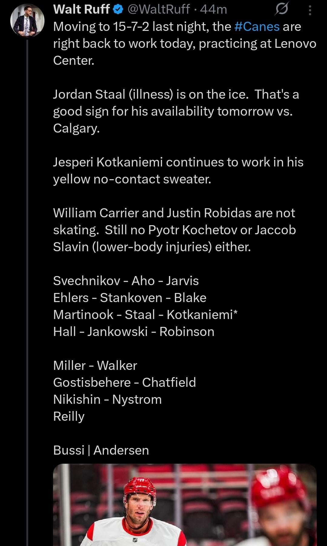 It seems like when one Canes player comes back another one gets injured. Carrier was having himself a very physical game. Hoping he’s just a bit sore and they are letting him rest.