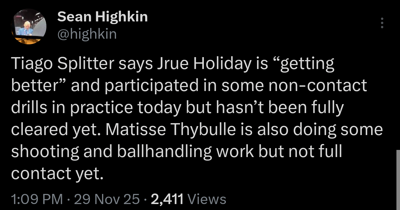 [Highkin] Tiago Splitter says Jrue Holiday is “getting better” and participated in some non-contact drills in practice today but hasn’t been fully cleared yet. Matisse Thybulle is also doing some shooting and ballhandling work but not full contact yet.