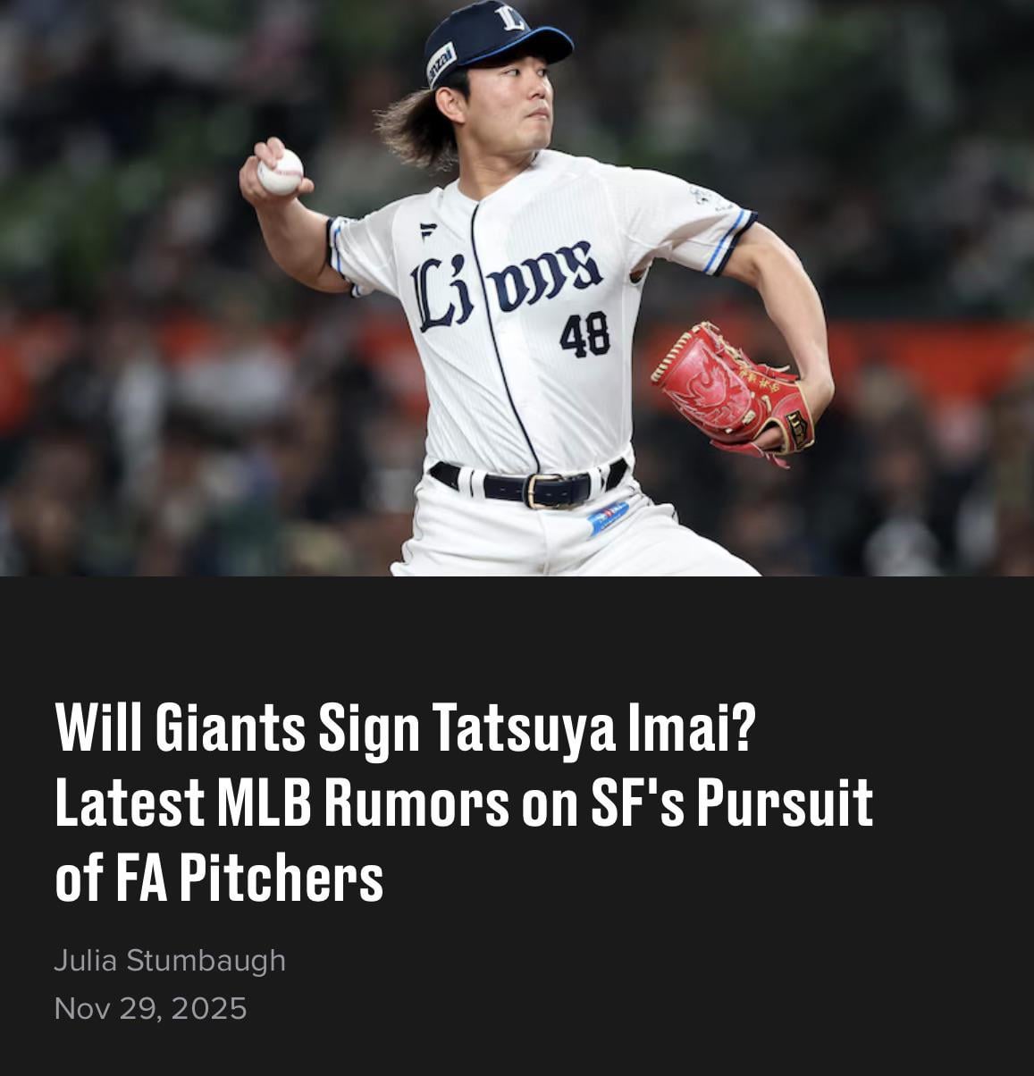 ESPN's Buster Olney poured a bit of cold water on rumors that the San Francisco Giants could land NPB All-Star pitcher Tatsuya Imai in free agency this winter.