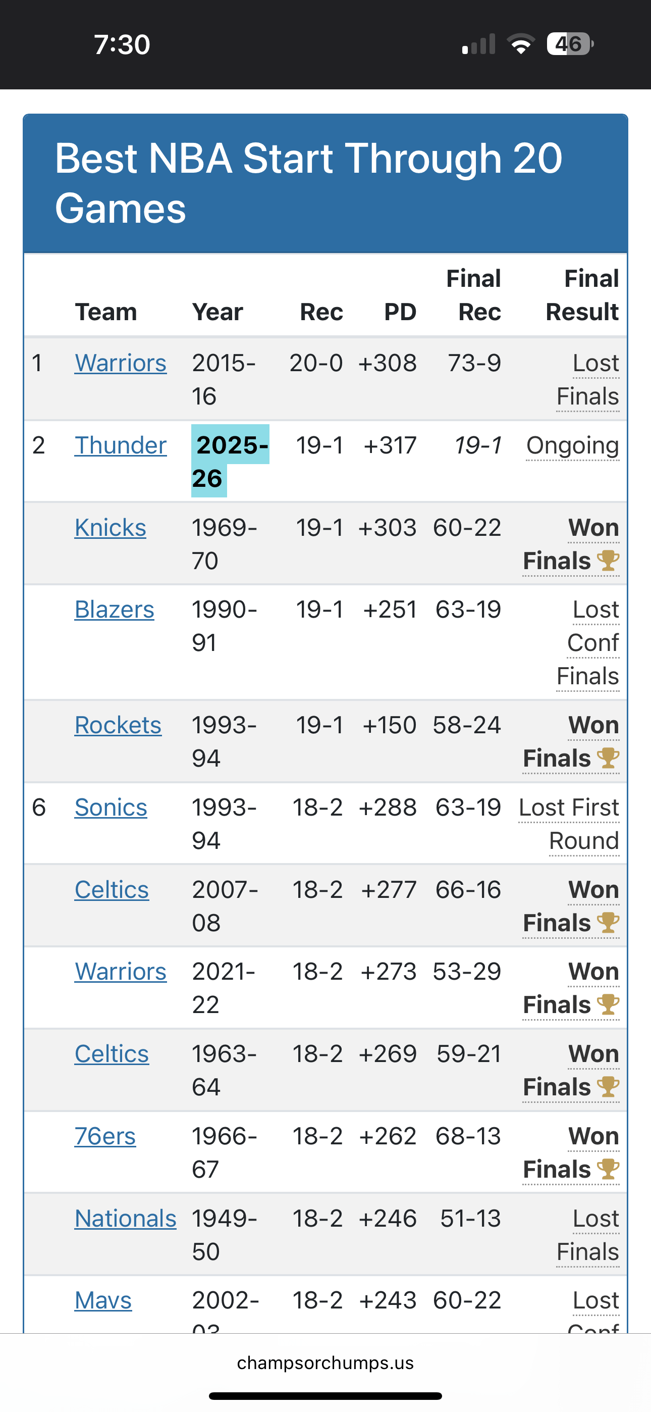 2. I remember that Nuggets team with Mutumbo beating the Sonics as an 8 seed. Forgot that the Sonics were so dominant.