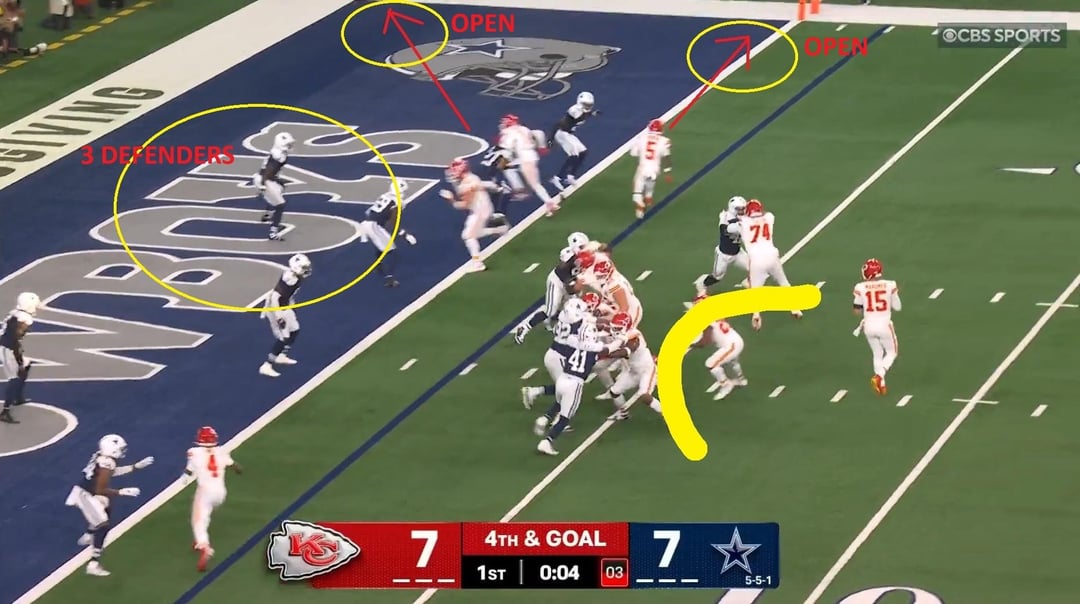 Kelce is the least open, and it looks like another case of Pat deciding where the ball is going regardless of how the play develops.