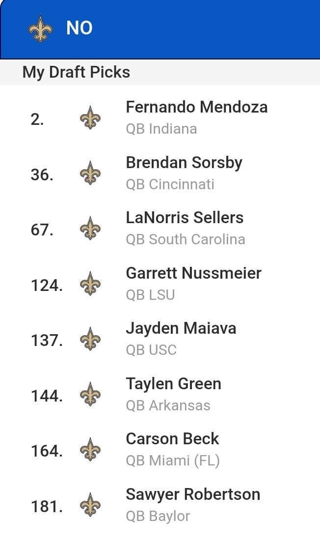 How'd I do? I think we got some good value here. 27 comments This is the content I’m here for  One of them has to work out eventually, right? One of them has got to be good right? Haha I’m sensing a pattern. Ones gotta hit. Betting black, red, first 12, second 12 and third 12. Does Nussmier even get drafted? he got benched One of these guys has to hit right?! Here’s a man of taste who knows how to play the lottery I mean, it’s working for Cleveland. (Oh I crack myself up) I doubt Sellers is coming out lol #depth Sorsby is going to the portal, but if we draft him everyone associated with the team needs to be fired – Cincy alum But you’re wrong. We are picking #4. Giants and raiders will be #2 and #3. We will beat the titans and falcons to get 2 more wins lol Confirmed Browns moment The Browns strategy Upvote for the pure effort Do this for a few years, and none of the other teams in the league will have any QB’s, and at that point we’ll be unstoppable. Bringing back the 3 QB formation like we did years back with Taysom at QB, and Brees and Bridgewater out wide i see. and we’d miss on them all Nussmeier at 124 is a mistake No Simpson? F- What would happen if we go all long snappers? Switch Beck and Nuss Corner that market! Same but O line. Jk they did that already. 🤞 please Leave a ReplyYou must be logged in to post a comment.
