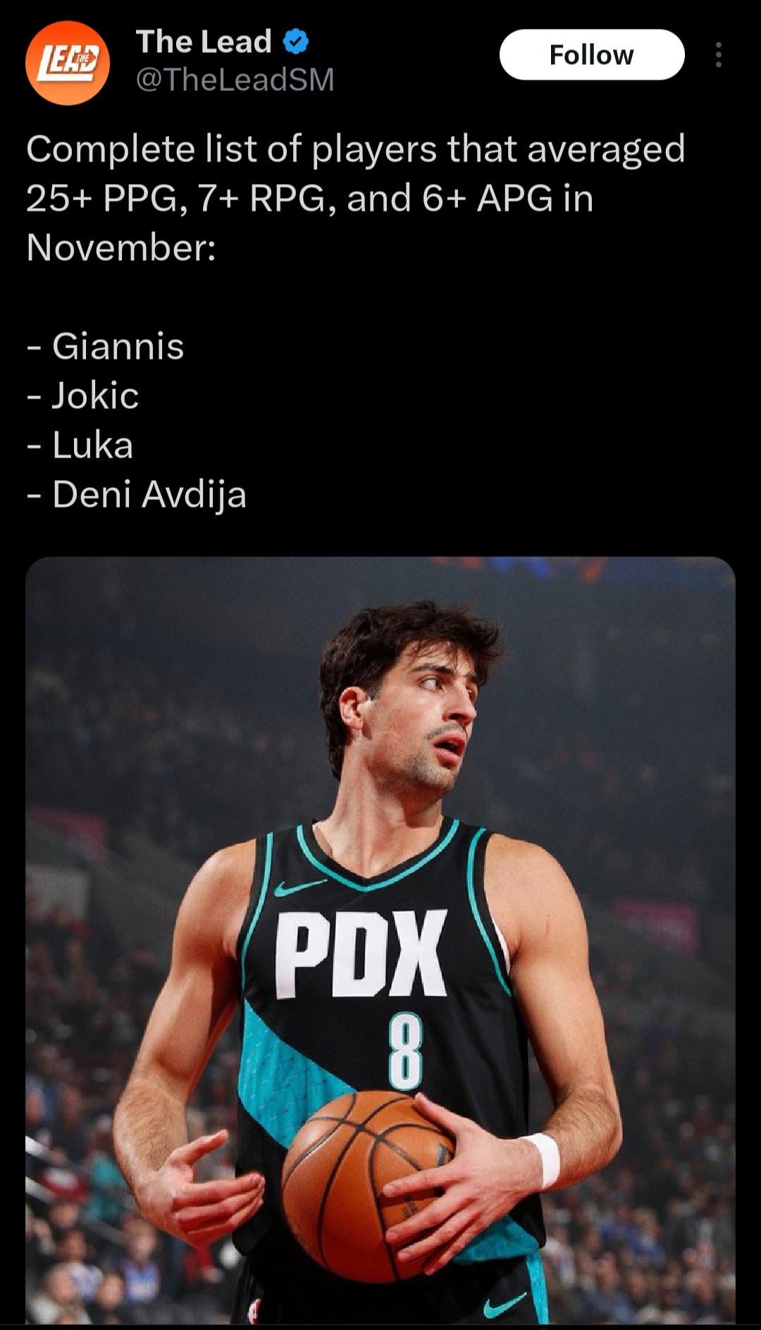 1. This sounds nice, but between those 4 players Deni’s points, rebounds and assists are all the lowest, right at this self-imposed random line, while the other three are mostly near the top of the leaderboards for all three.