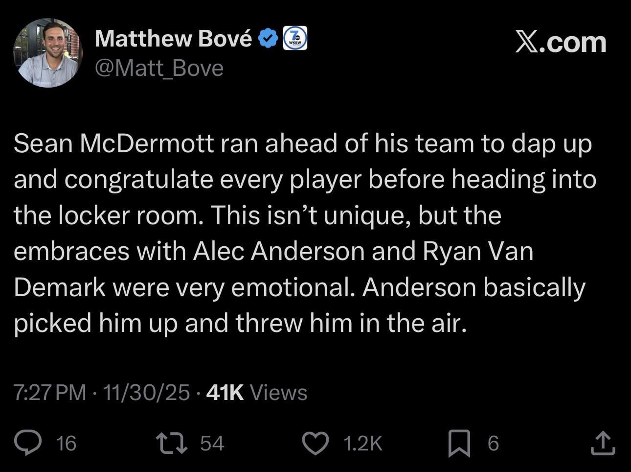 Sean McDermott ran ahead of his team to dap up and congratulate every player before heading into the locker room. This isn’t unique, but the embraces with Alec Anderson and Ryan Van Demark were very emotional. Anderson basically picked him up and threw him in the air.