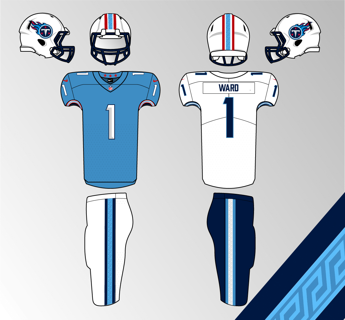 Its rumored that we will have new uniforms for 2026, but I wanted to create my own concept for what I think a nice kit would look like. I tried making the Greek pattern match the shape of Tennessee, and even though I’m not the biggest fan of leaning into the pattern look, I think if it is subtle enough, it could work. This would be a mix of past and present titans uniforms. anyways I’d love to hear your thoughts on these. (Not pictured is a hypothetical light blue pant option)