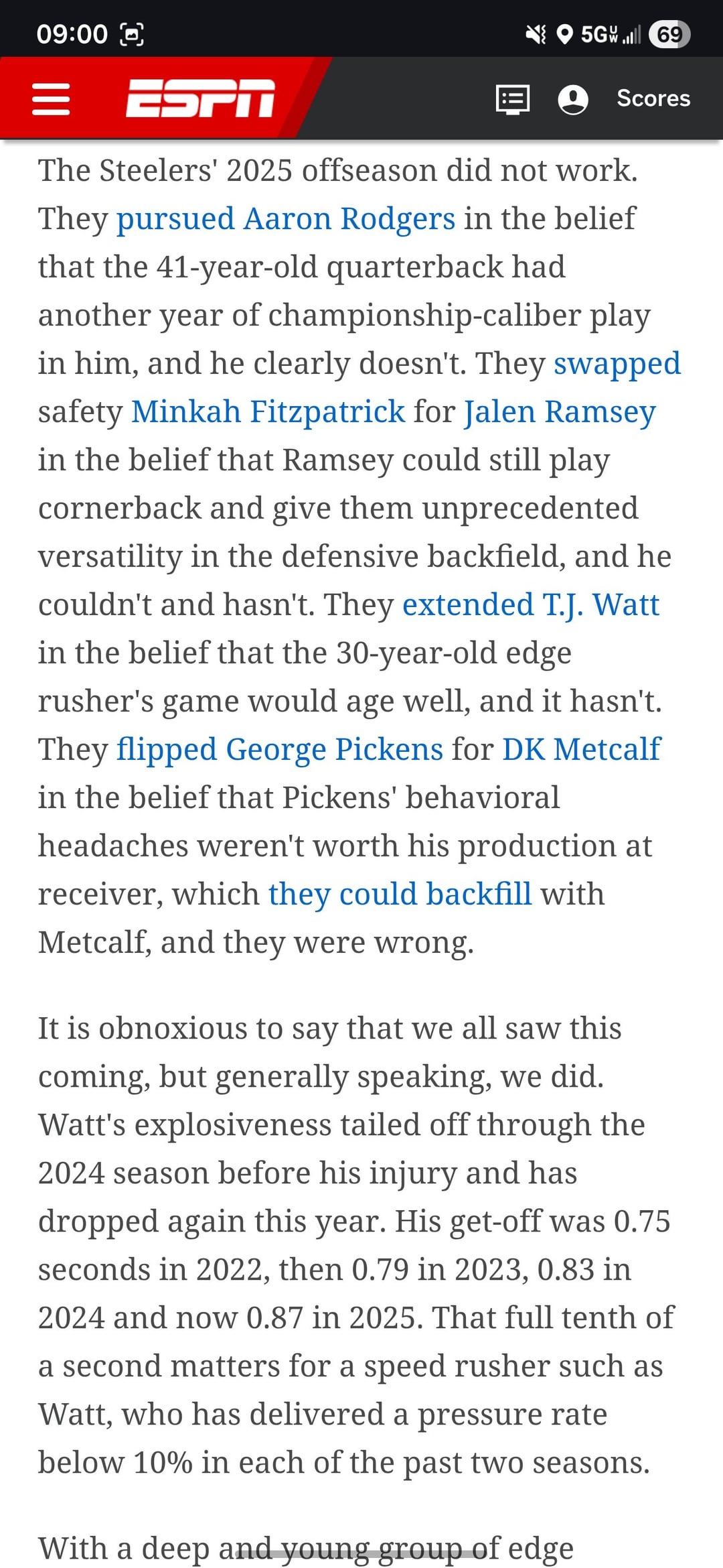 The TJ Watt contract is by far the biggest disaster of any of these. He has fallen off a cliff, and his new contract hasnāt even really started. We are locked into paying him like a franchise QB for years and he is invisible every game now.