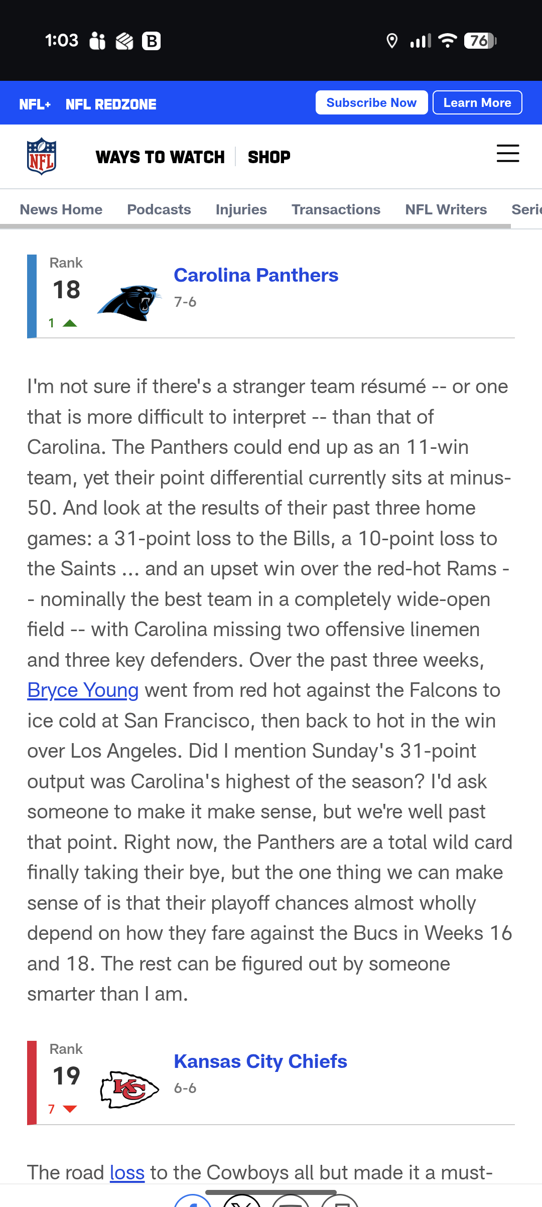 5. What I don’t like about these power rankings is that it’s clear they don’t watch the games. It’s just “I dunno what to make of them!?” Welp, they could take an opinion on Canales’ play calling. Like *something*. I guarantee you that if you ask any regular Panthers podcaster from Rashad to Aaron Duncan to Chris at Charlotte Vibe, or reporters like Vashti *they* have answers for your questions.
