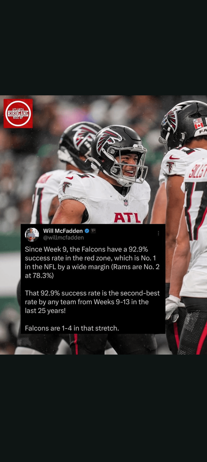 Assuming that this means the falcons are 13/14 as we’ve scored 13 redzone TDs in weeks 9-13. Which means we have ~3 trips to the red zone per game which seems… not great? I don’t know what’s average across the league. Good on us for converting but also lacking on explosive plays and converting on 3rd down.