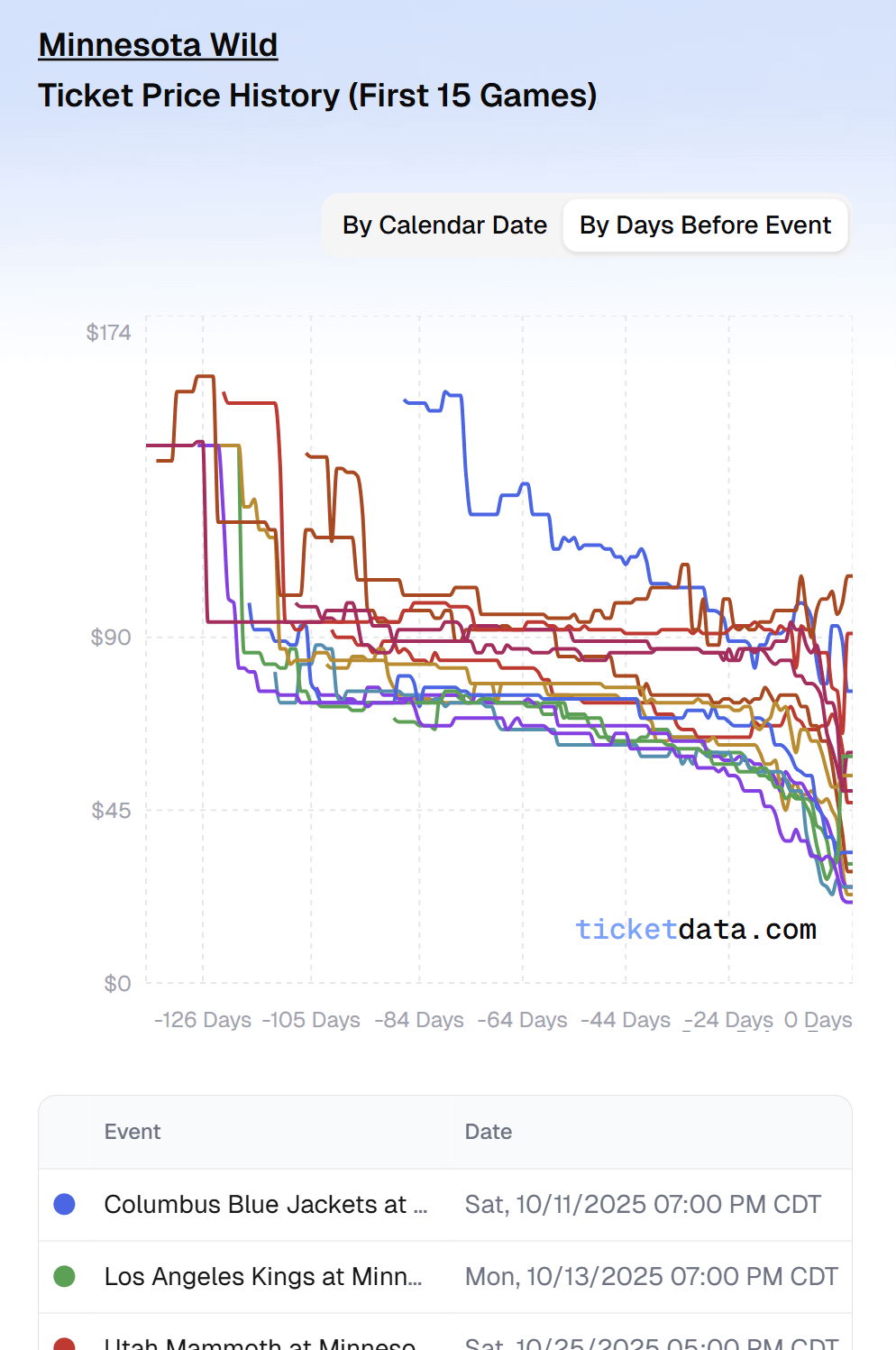 I have been looking at different teams to see which ones follow clear price patterns, and the Wild data has been very consistent. So far this season, *every* Wild home game has dropped in price when comparing the price 30 days out to the price 24 hours before puck drop. On average, the price 24 hours before the game has been 34% cheaper than it was a month before the game.
