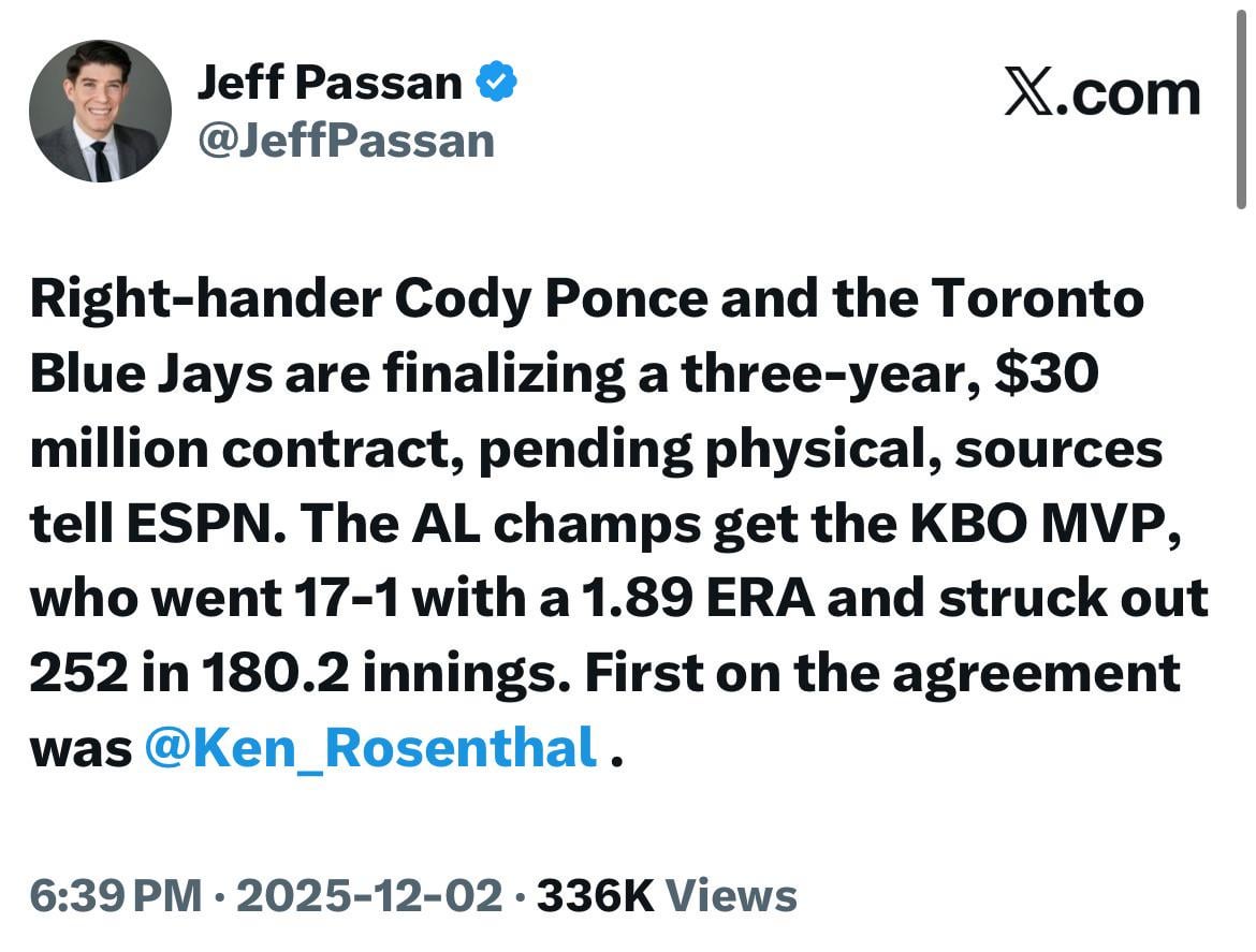 [Passan] Right-hander Cody Ponce and the Toronto Blue Jays are finalizing a three-year, $30 million contract, pending physical, sources tell ESPN. The AL champs get the KBO MVP, who went 17-1 with a 1.89 ERA and struck out 252 in 180.2 innings. First on the agreement was @Ken_Rosenthal .