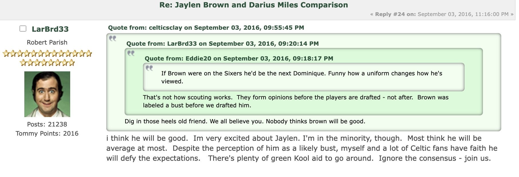 "I still think Jaylen has potential to be very good. When he was drafted he was really raw but the hope was that he'd develop like Jimmy Butler – a rare instance of a player who took 5 years to slowly develop into a star. FWIW, Jimmy shot 39% from the field and 28% from three during his 3rd season – so maybe there is still hope for Jaylen."