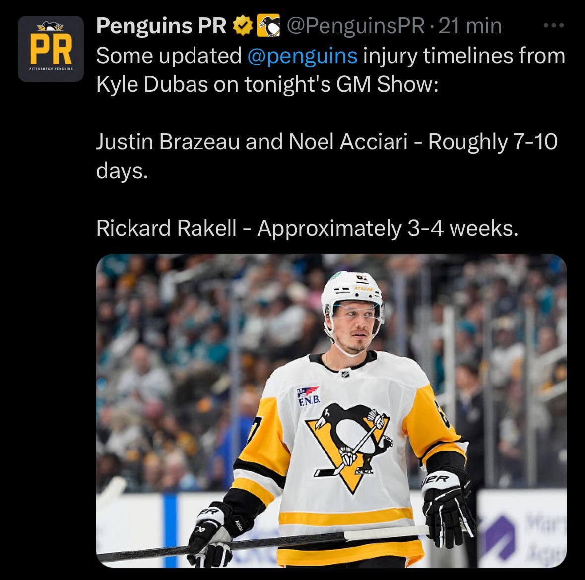 [Penguins PR] Some updated Penguins injury timelines from Kyle Dubas on tonight’s GM Show: Justin Brazeau and Noel Acciari – Roughly 7-10 days. Rickard Rakell – Approximately 3-4 weeks.