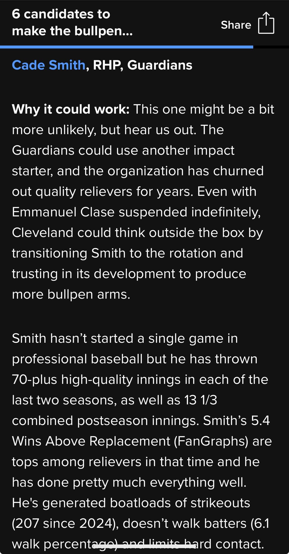 Where do these people come up with these takes? “The Guardians could use another impact starter,” says Brent Maguire, so they should convert Smith to a starter. I realize that the national writers don’t know much about the Guardians, but yeesh!