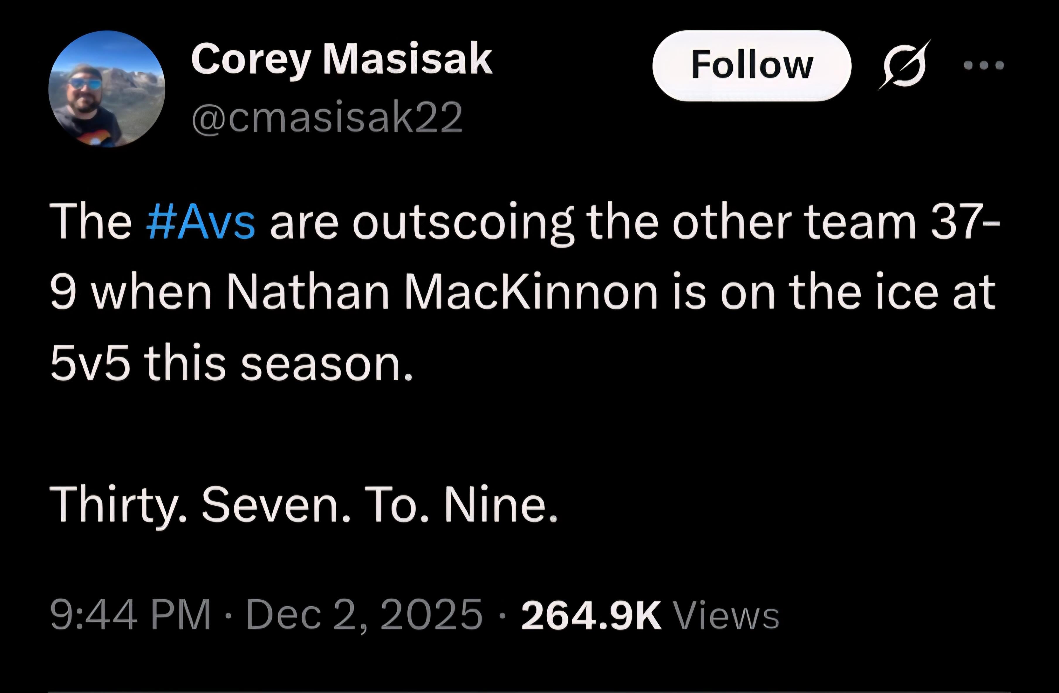 The best related stat I can find on MacK is when he’s on the road and the other head coach gets last change, the Avs are outscoring the opposition 23 to freaking 7 during 5v5. That’s a GF% of over 75% against the NHL’s absolute best defenders