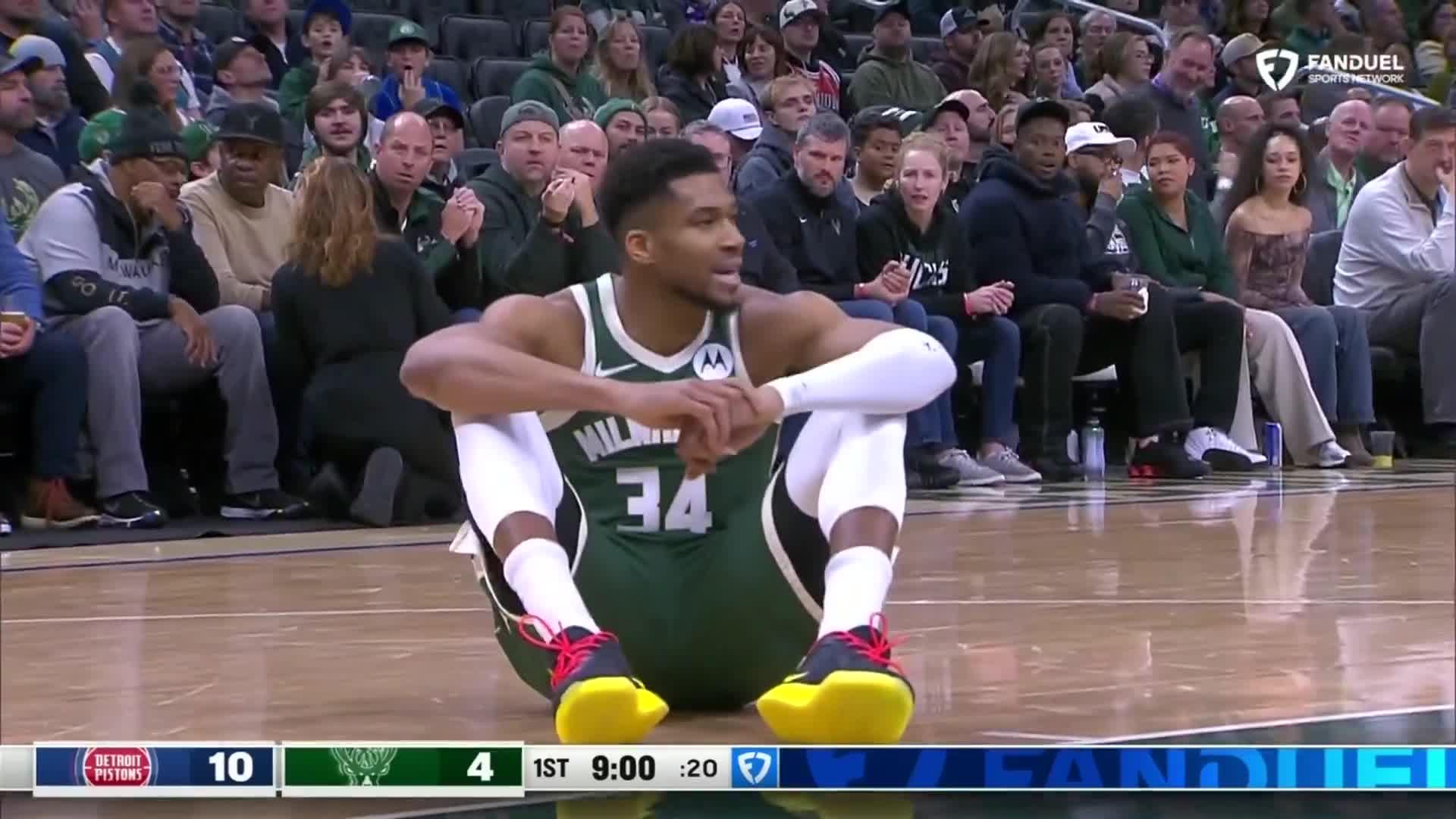 [Injury] Giannis Antetokounmpo appears to suffer a non-contact leg injury early in the game against the Pistons. He walked to the locker room on his own power.