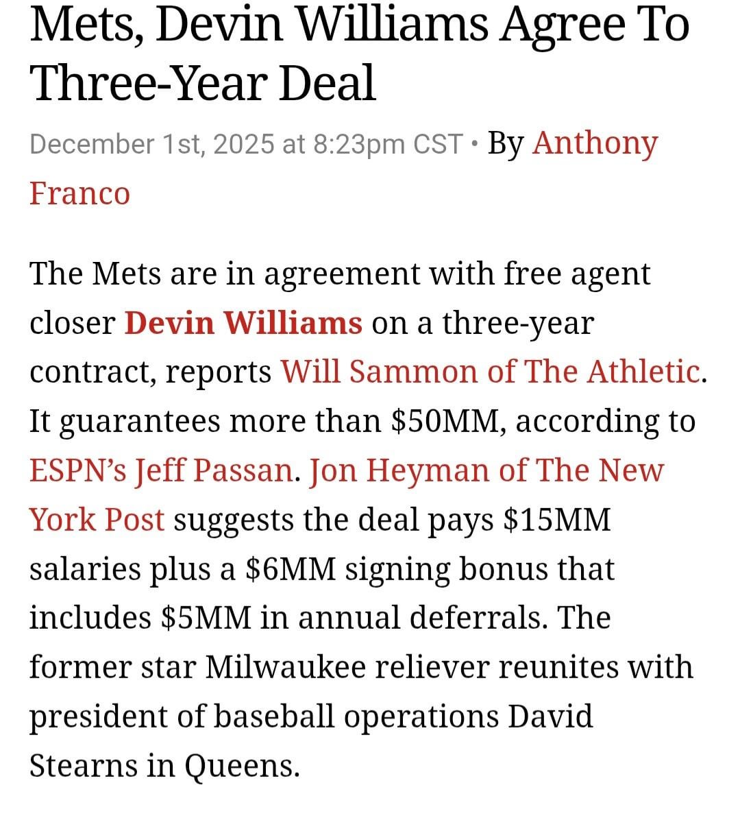 Deferred money involved with the Devin Williams deal, and as you guys saw Anthony Dicomo and Andy Martino said they’re still in on re-signing Diaz. Stay positive