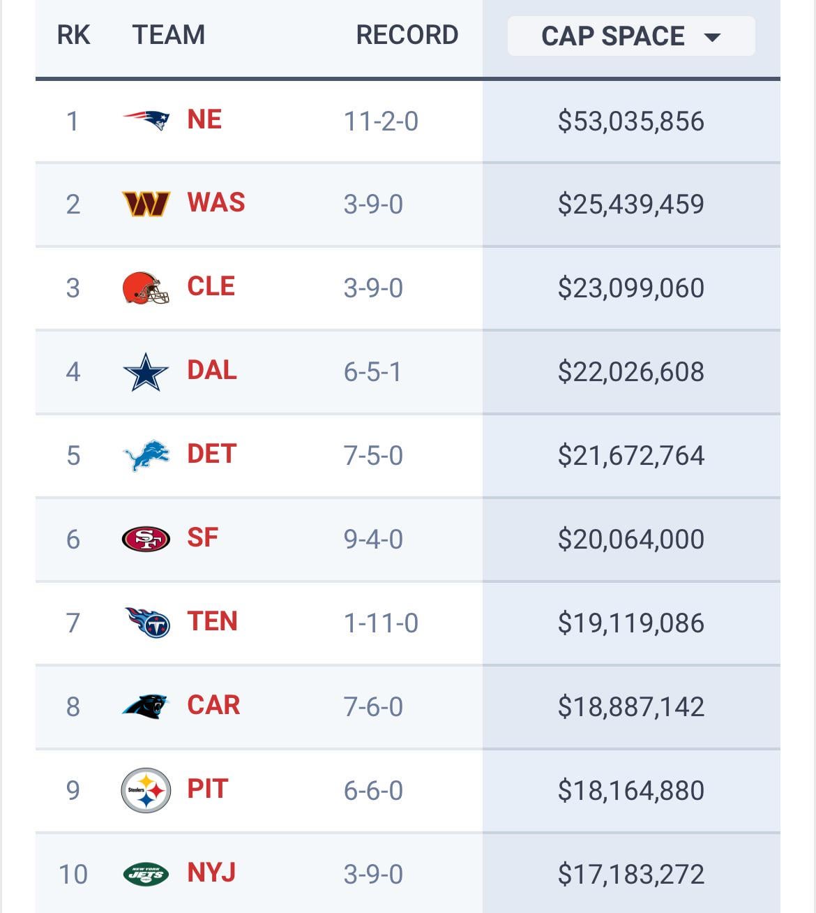 Pats are 10th in available cap next season.
