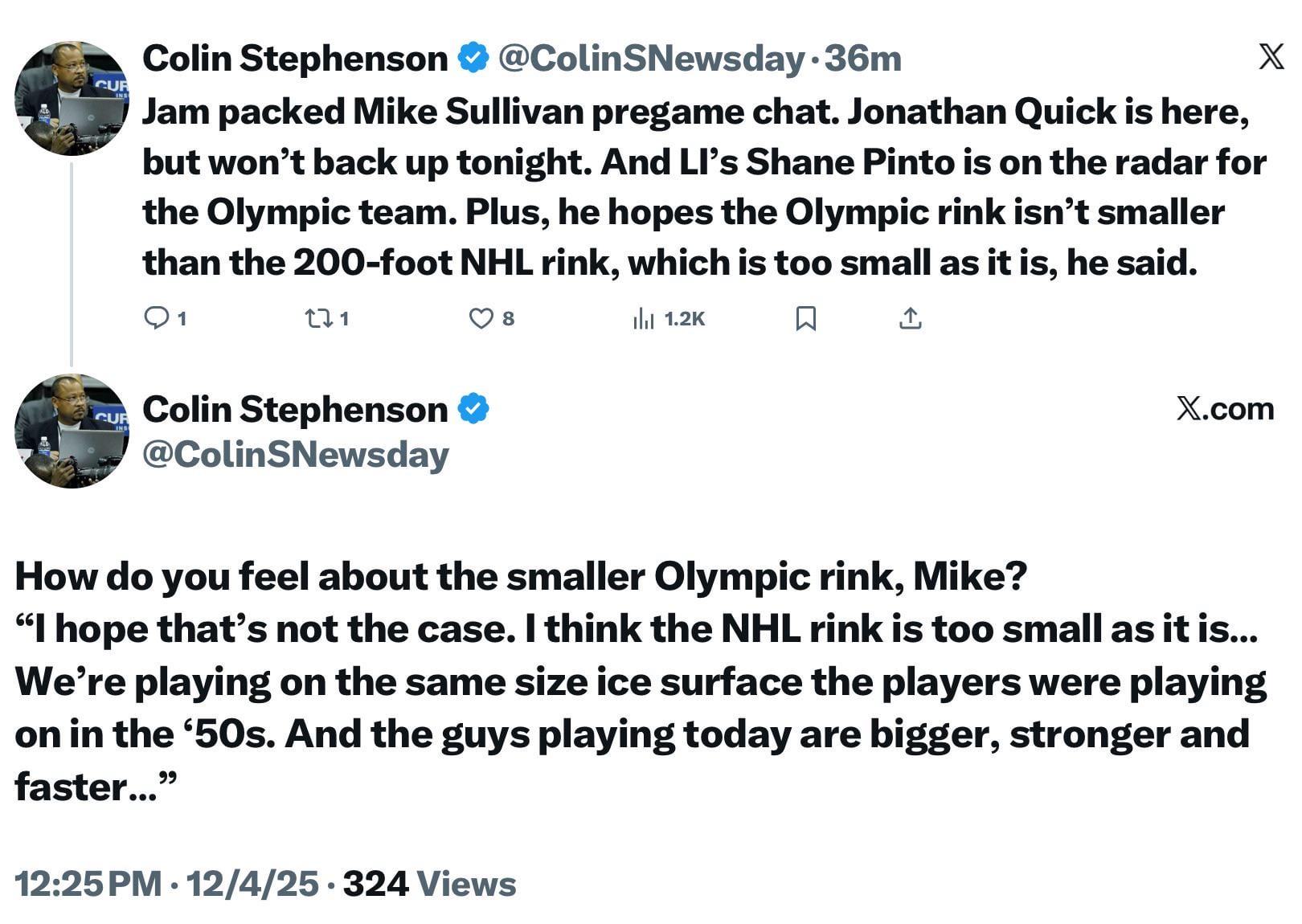 [Stepheson] Jam packed Mike Sullivan pregame chat. Jonathan Quick is here, but won’t back up tonight. And LI’s Shane Pinto is on the radar for the Olympic team. Plus, he hopes the Olympic rink isn’t smaller than the 200-foot NHL rink, which is too small as it is, he said.