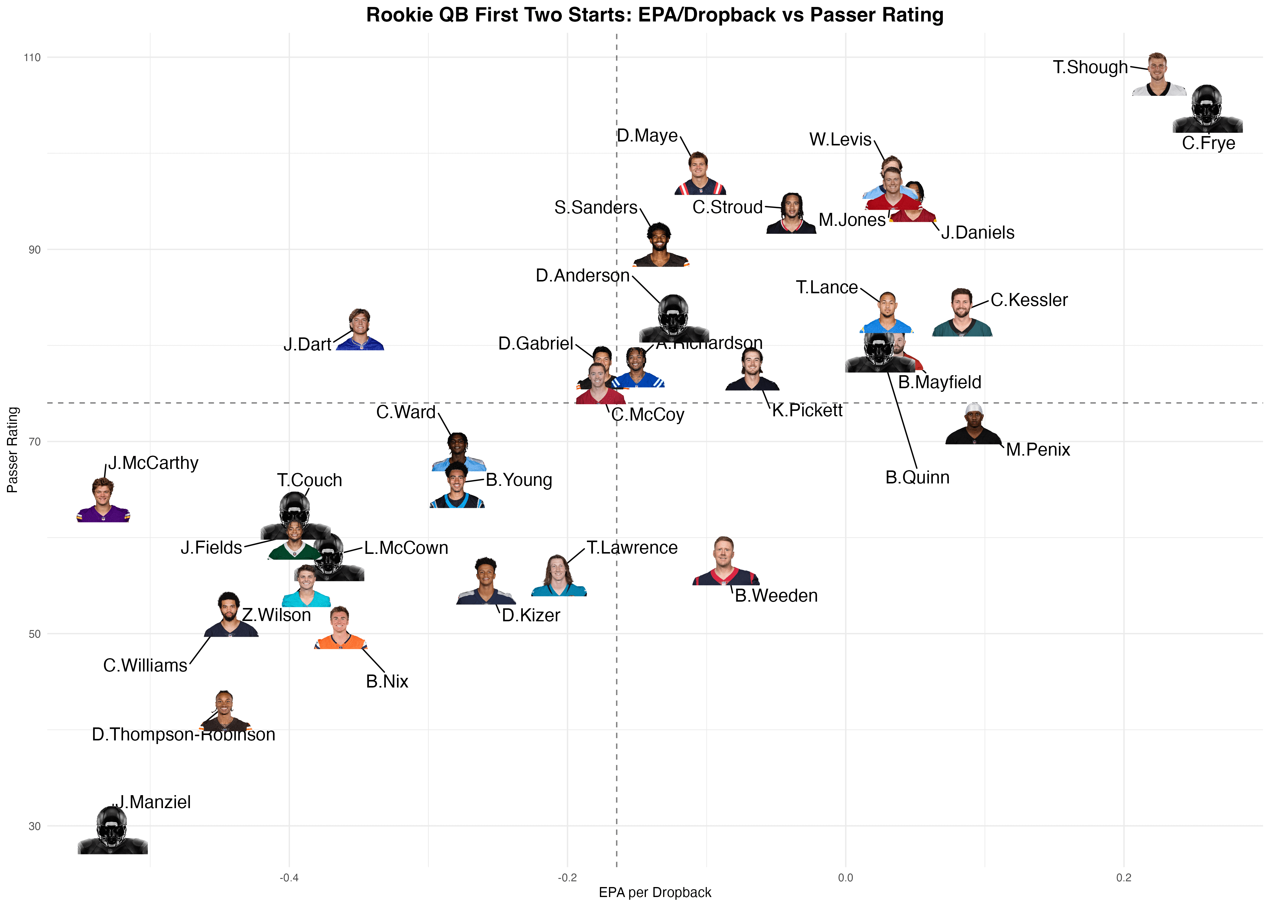 Also, please note that this is EPA per dropback, not EPA per play (i.e., it will be different from what you'd see on rbsdm.com which is EPA per play).