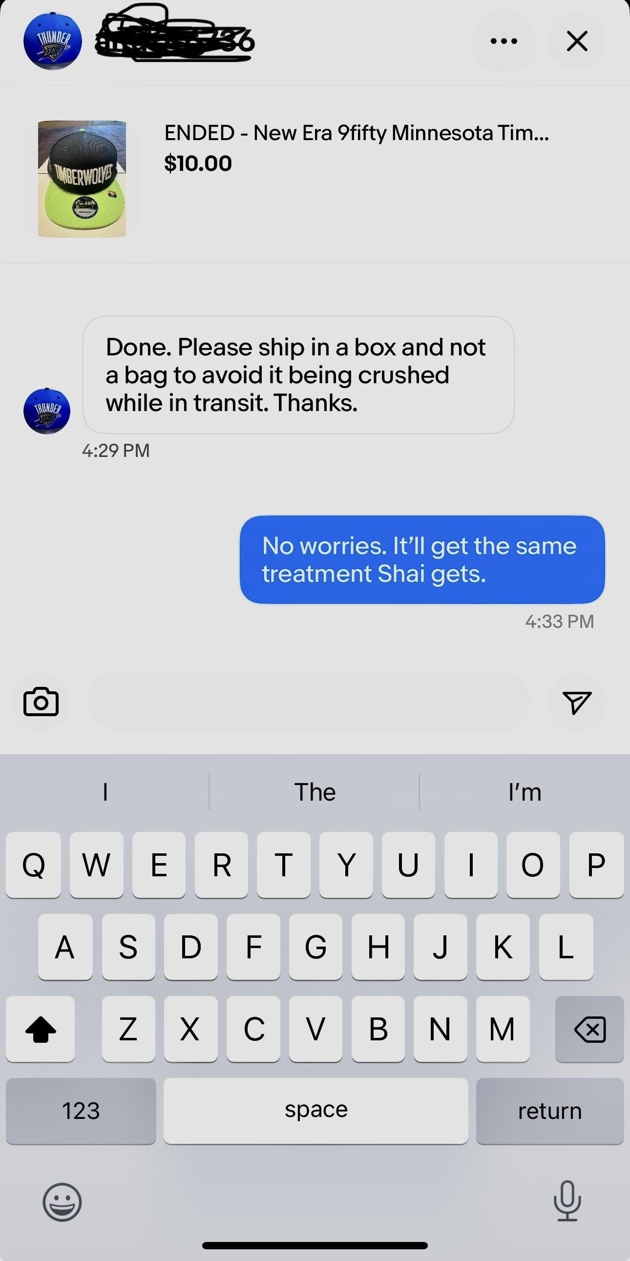 Sold a Timberwolves hat to a thunder fan on eBay and had to take a shot. 4 comments Must have been shipped with priority and a fragile stamp on it too! Imagine the driver having to sit on the line and wait for the customer to shoot 2 free throws for it being put in his mailbox too hard We’re all out here doing the work. It’s not even just shai. Did anyone watch a replay of the hartenstein flop? Leave a ReplyYou must be logged in to post a comment.