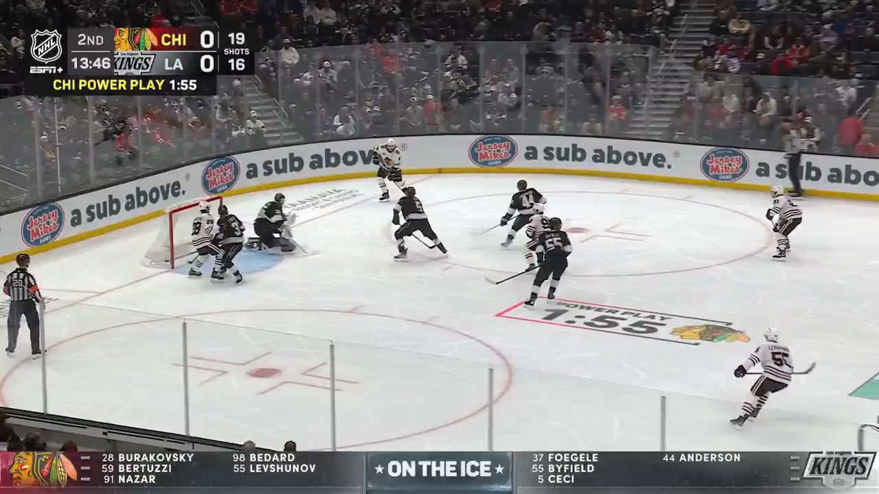 Connor Bedard falls down after scoring his 18th of the year and immediately gives credit to Tyler Bertuzzi for the pass