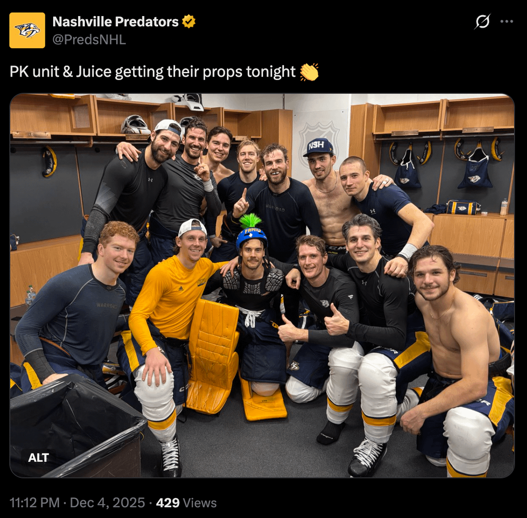 [Stamkos (in place of Ozzy) gave the paddle and helmet to the entire PK and Juice. ](https://x.com/PredsNHL/status/1996804296277696831?s=20)I have no idea how exactly to put into the leaderboard, though. Does Juice get separate credit? Does the PK get their own line?