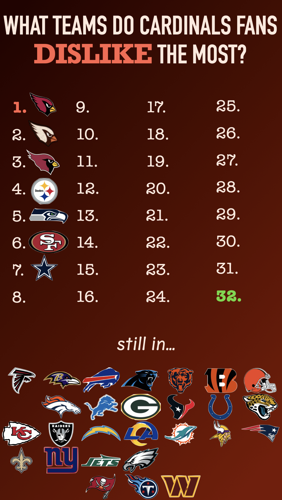 Round 8: The Cowboys can get wrecked (just like they did tonight). What team do you hate the 8th most? Top comment picks. 22 comments can we get bidwill in here The Lambs are a pretty clear choice now Rams go next. Rams is the obvious next choice but I’m going with a sleeper pick, the Arizona Cardinals Too many packers fans in town Rams. No idea why people even voted for the cowboys when the rams have been dog walking us for years now Gonna keep repeating this one til they get on here Fucking panthers for what they did to our 13-3 season Also the “I’m baaaaack” moment from Cam Also the fact that aside from this season they always manage to kick us in the dick regardless of whether they’re having a shitty season or not For shits and giggles do the Cardinals again  The San Antonio Spurs Browns Panthers. We’ve lost to them way too many times in important moments DREW PETZING F$ck the Rams ! Panthers How are the 🐑s still there? Don’t guys even watch the cardinals? Its needs to be cardinals related for any reason. Broncos Panthers, ruined our 2015 season then got BTA-d in the Super Bowl The one time aj green didnt turn around Gotta be rams now These posts are very cringe please stop Let’s just ignore the Lambs completely. Panthers! Leave a ReplyYou must be logged in to post a comment.