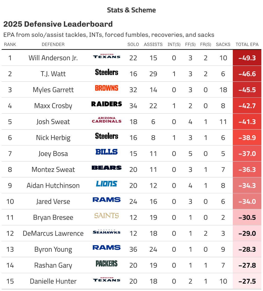 This is even worse than PFF. How can a team have two players on the same defense in the top 6 that are supposedly impacting games, but they are on one of the worse defenses in the NFL? It doesn’t even make sense. Where is this data from?
