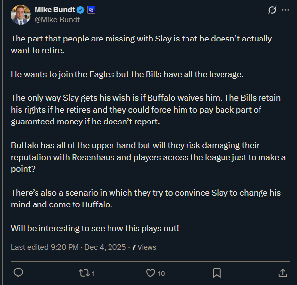 I seriously doubt Rosenhaus would rid all business associated with the Bills on a near to retirement player when he has tons of clients. This one might hurt but he should be encouraging Slay to give it a chance and see how it goes playing. Who knows maybe another Super Bowl 🤷♂️. Going to the Eagles wasn’t a guarantee. Who knows if they would have taken him. A crazy scenario would be him not wanting to be in Buffalo because he wants to go to Philly and Philly ends up not wanting him at all and or picks up someone else… honestly Fack him and let him go but have him forfeit his money from the Bills.