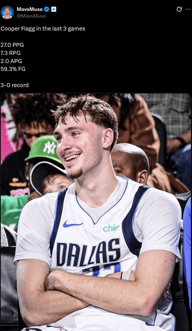 Cooper Flagg’s Elite Production Over The Last 3 games: 27.0 PPG, 7.3 RPG, 2.0 APG 59.3% FG, 34.2 MPG. Cooper Is The Youngest Ever To Score 20+ Points In 3 Straight Games. Only Other 18 Year Old With 3 Straight 20+ Games All Time: LeBron James. 3-0 W/L Record