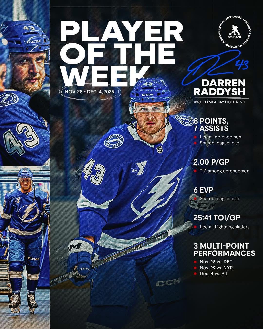 As a longtime Raddysh truther, itβs been awesome to see him really step up lately. He had a tough start to the season (like everyone did) but heβs been absolutely crucial lately with the injuries weβve had.