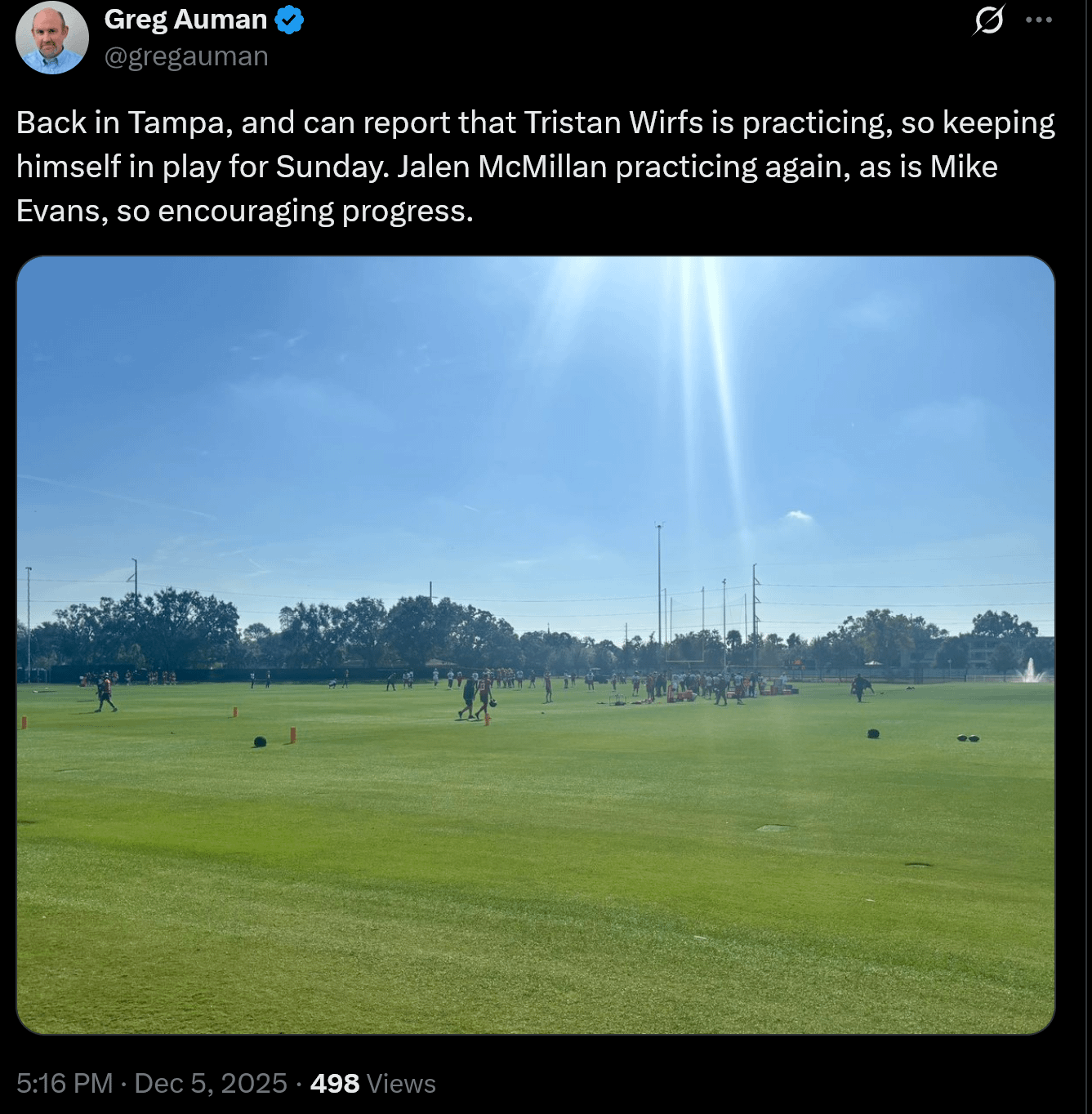 [Greg Auman] Back in Tampa, and can report that Tristan Wirfs is practicing, so keeping himself in play for Sunday. Jalen McMillan practicing again, as is Mike Evans, so encouraging progress.