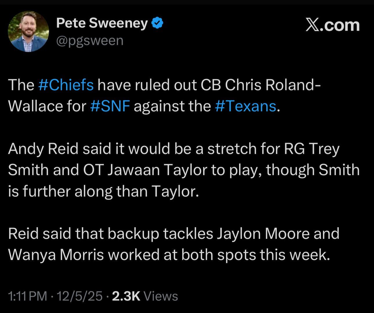 [Sweeney] The #Chiefs have ruled out CB Chris Roland-Wallace for #SNF against the #Texans. Andy Reid said it would be a stretch for RG Trey Smith and OT Jawaan Taylor to play, though Smith is further along than Taylor. Reid said that backup tackles Jaylon Moore and Wanya Morris worked at both spots