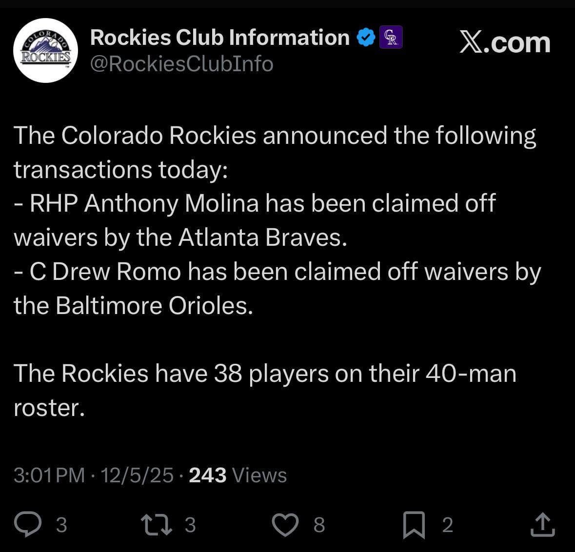 [Rockies] The Colorado Rockies announced the following transactions today: – RHP Anthony Molina has been claimed off waivers by the Atlanta Braves. – C Drew Romo has been claimed off waivers by the Baltimore Orioles. The Rockies have 38 players on their 40-man roster