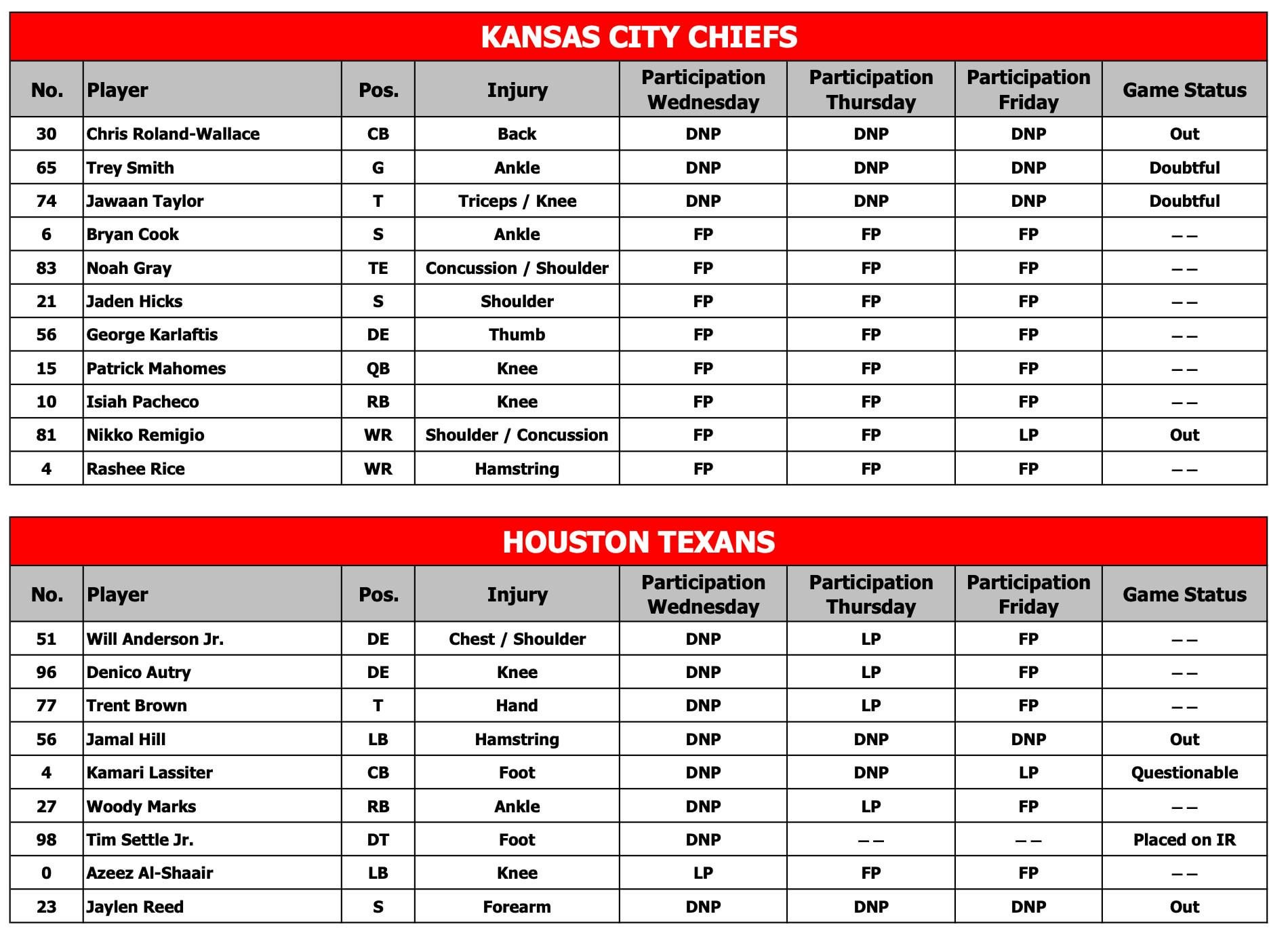 [McMullen] Final injury report of the week is here. CRW and Nikko Remigio are out, Trey and Jawaan are Doubtful. Everybody else was a full participant.