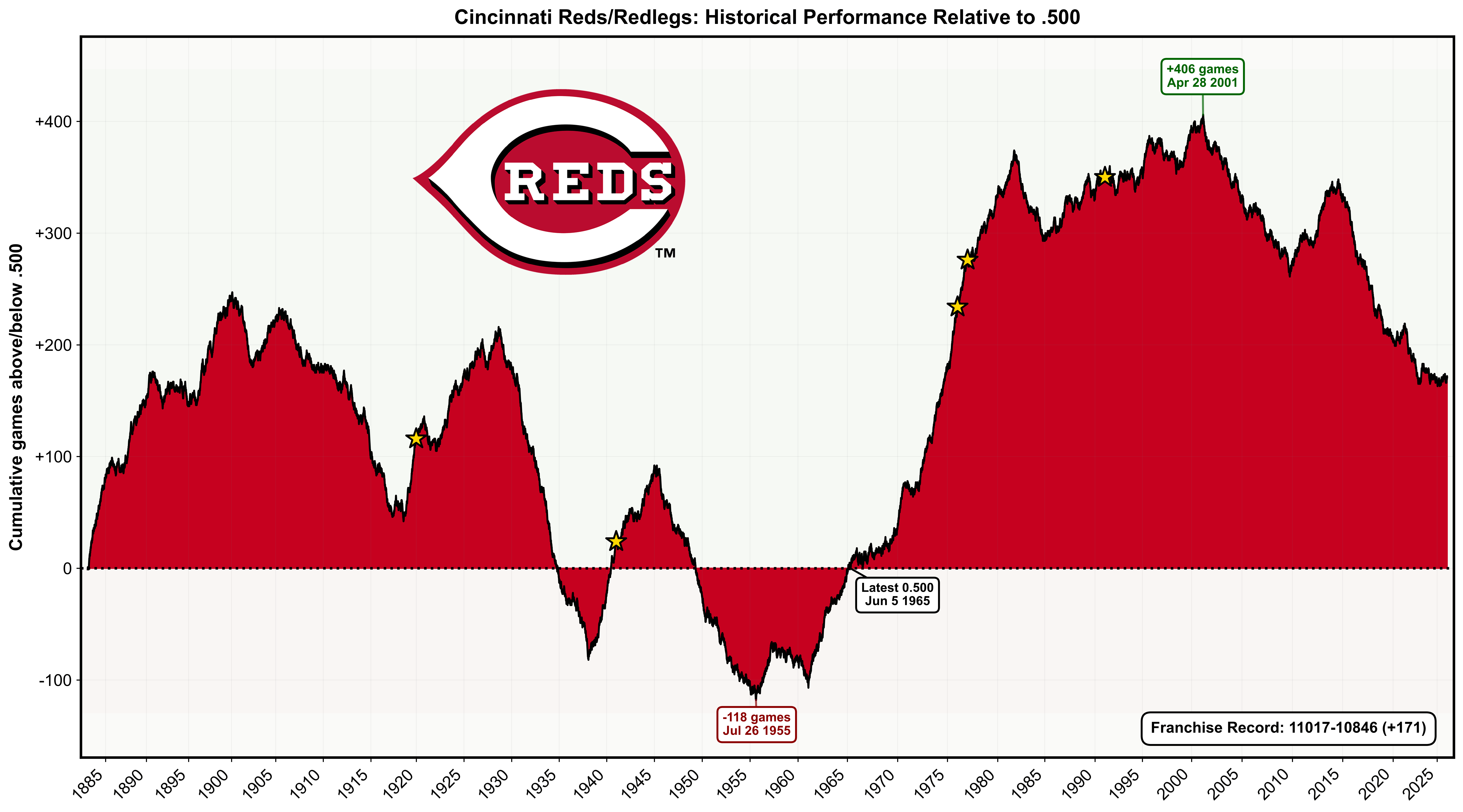 The annotations show the franchise's all-time peak, lowest point, and most recent time at exactly .500.