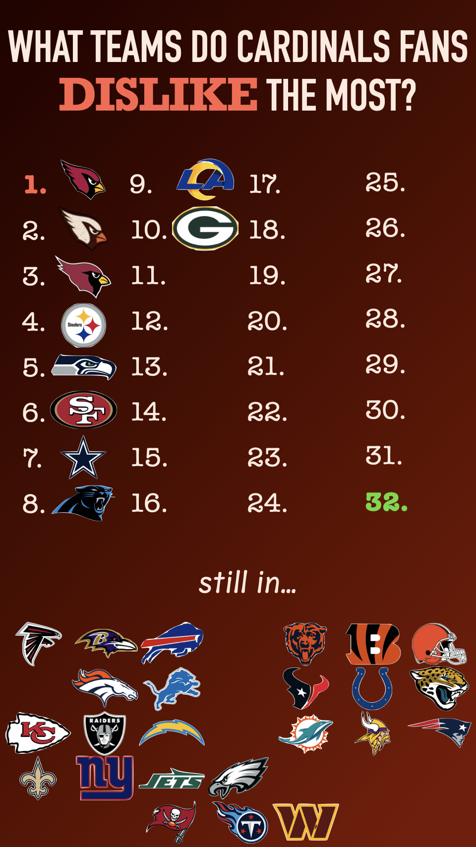 Sorry guys, but I'm ignoring the comments saying the Cardinals, non-football teams, Petzing, or Bidwill from here on. I am not morally against shitposts, but I'm going to make sure to carry this countdown through. Mainly because I'm actually genuinely curious how other Cardinals fans think of all the other teams.