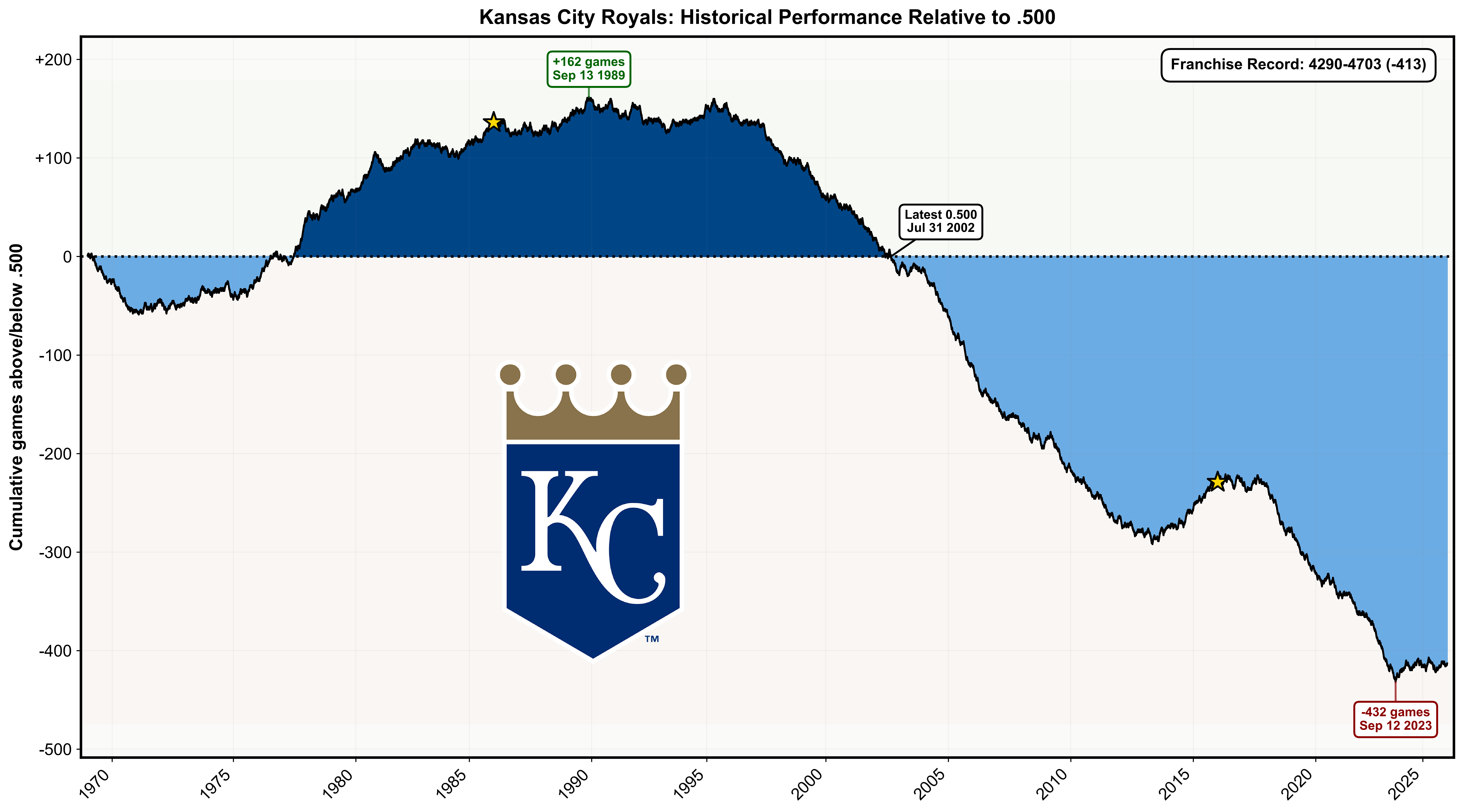 The annotations show the franchise's all-time peak, lowest point, and most recent time at exactly .500.